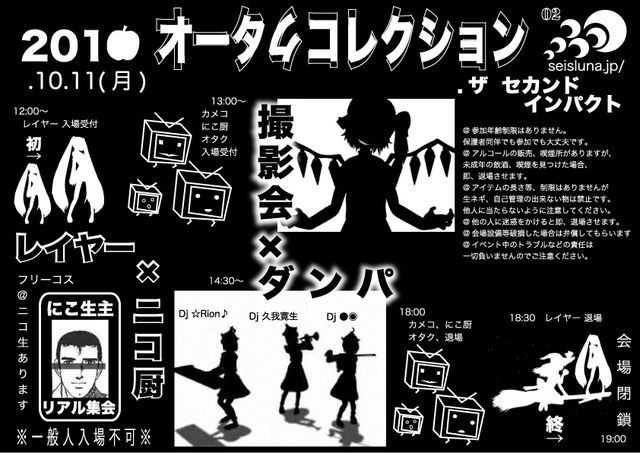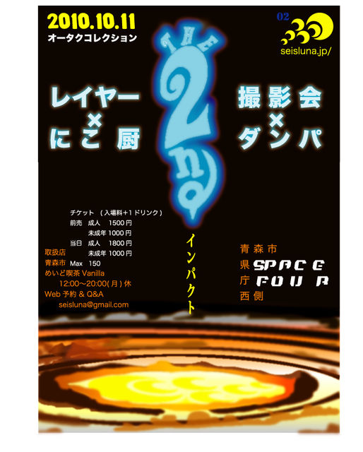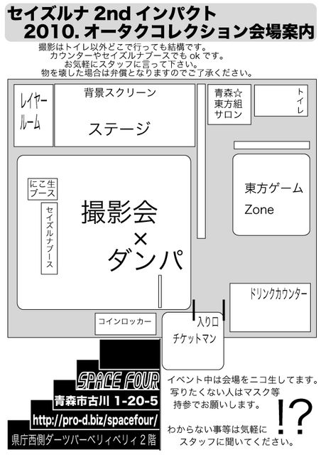 日時 2010.10.11 場所 青森市古川 ( 県庁西側 ) Space Four PC http://prod.p1.bindsite.jp/spacefour/access.html Mo http://pro-d.biz/spacefour/mobile_index.html レイヤー × にこ厨 撮影会 × ダンパ @ニコ生アリマス タイムシフト 12:00〜 レイヤー入場 13:00〜 オタク、カメコ、ダンサー入場 13:00〜 撮影会 14:30〜 ダンス 18:00〜 オタク、カメコ、ダンサー退場 18:30〜 レイヤー退場 19:00〜 会場閉鎖 料金 (入場料+1ドリンク) レイヤー、カメコ、ダンサー、オタク一律 前売 成