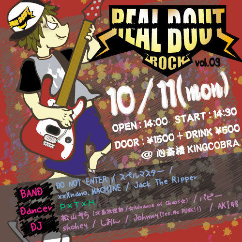 【REALBOUT ROCK 〜vol.3〜】 10/11(月)祝日 場所:心斎橋KINGCOBRA OPEN:14:00 (予定) START:14:30 (予定) チケット:door only 1500円+drink代500円 <出演バンド> ・DO NOT ENTER(Hi-STANDARD) ・スペルマスター(マキシマムザホルモン) ・xxXnano.MACHINE(locofrank) ・まさゆき800(MONGOL800) <Dancer> ・PxTxH <出演DJ> ・松山そら(北高放送部/☆Advance of Chaos☆) ・バピー ・shohey ・しおん ・Johnny(Yes.We PUNK!!) ・AKI48 おかげさまで第三回開催が決定しました!ありがとうござい