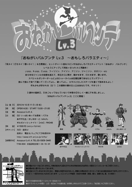 『おねがい♡パルプンテ Lv.3』 〜おもしろバラエティ〜 「見タイ!打ちタイ!歌いタイ!」を合言葉に、ヒットチャート曲をスピンするおもしろバラエティイベント「おねがい パルプンテ」!! レベル3にアップして阿佐ヶ谷loft Aに再襲来! J-pop、K-pop、C-pop、フィリソン、アイソン、アニソン、ジャニソン、ガガソン…etcあらゆるジャンルの垣根を越えて、珠玉のDJ陣が、聴かせます、打たせます、歌います。 スペシャルダンサーチームによるショータイムは狂喜乱舞であなたとランデブー!飲んで飲んで食べて踊って!打ってよし、歌っ