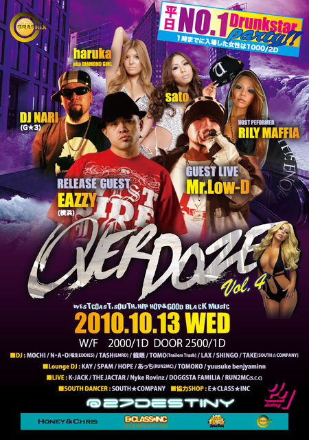 2010/10/13/水 渋谷27destiny OVER DOZE vol 4 平日NO 1 Drunkstar party!! (Good Hip Hop&BLACK MUSIC!!) ★☆1時までに入場した女性は1000/2D☆★ テーマは社交場★ 男女の比率も6:4 平日ではありえないくらいの振る舞い酒の量でBar売り上げが平日No1になりました 一人で遊びに来ても楽しめるようなeventを心がけて出演者一同雰囲気つくりしています ※エントランスでK-JACKのゲストといえば特別な料金で入場できます ※20歳未満は入場する事は出来ません。 顔写真付きの証明書,身分証など忘れないように持参ください