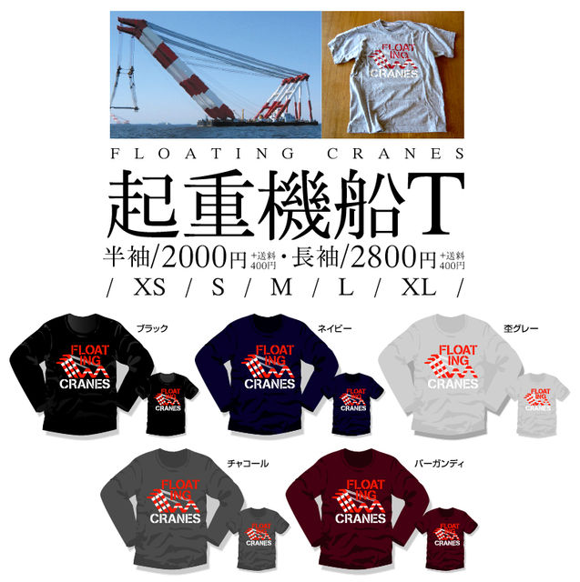 通販オファー終了しました〜 2010/10/12 23:59〆切でした ---以下オファー受付時の告知です--- 【起重機船T】復刻です。 もし狙ってたよ!という方いらっしゃればどうぞ これがラスト復刻となりますので (工場が版を廃棄してしまうため) お見逃しなき様お願いします。 Color*5 半袖=ブラック/ネイビー/杢グレー/チャコール/バーガンディ 長袖=ブラック/ネイビー/杢グレー/チャコール/バーガンディ Size*5 XS|S|M|L|XL | Size*5 XS|身幅43×着丈58 S |身幅47×着丈65 M |身幅50×着丈68 L |身幅5
