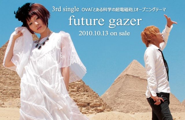 10月13日リリース!「future gazer」 [収録曲] 1. future gazer (OVA とある科学の超電磁砲 OPテーマ) 2. fortissimo-the ultimate crisis- (PCゲーム fortissimo//Akkord:Bsusvier 主題歌) 3. future gazer 4. fortissimo-the ultimate crisis- 初回限定盤仕様 「future gazer」プロモーションビデオ メイキング映像 発売中バージョンのCM 特別に作成したスペシャルバージョンのCM