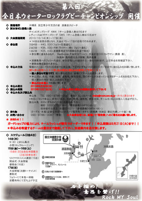 taishiです。 今年の全日本ウォーターロックラグビーの日程が決定しました!! 大会は10月15日(金)〜17日(日) 合宿としては、14日(木)〜17日(日) 場所は例年と同じ、沖縄県の渡嘉敷島になります。 チームでの参加も、個人での参加もオッケー。 *個人参加の方は、現地にて他の個人参加の方とチームを組むことになります。 チャンピオンズリーグ・レディースリーグ・ビギナーズリーグを開催予定。 (*申込状況によって、ビギナーズリーグは無くなる場合があります。) 詳細は決まり次第またアップします。