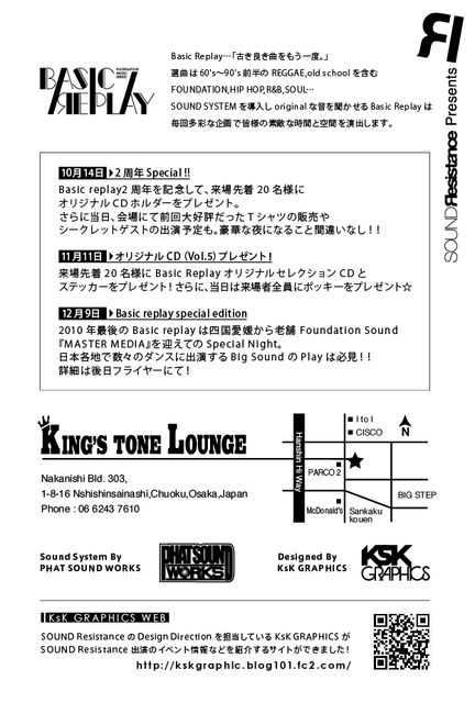 Resistance CREW Presents… 『Basic replay 2周年Special!!』 2010.10.14(THU) @KING'S TONE LOUNGE START 23:00〜Till Morning ADM:\500 SOUND/ SOUND Resistance . SCREW I . JUNYA S-STEADY . Jammy's Jr,KO-HEY . 5GR Resident Artist/ RIP STICK.LABBA BOOM Supported by…PHAT SOUND WORKS with SOUND SYSTEM 古き良き曲をもう一度… 毎月第二木曜日、KING'S TONE LOUNGE で開催されるBasic replayは 貴方に素敵な空間と時間と音楽をお届け致します。 10月はBasic replay2周年を記念して、来場先