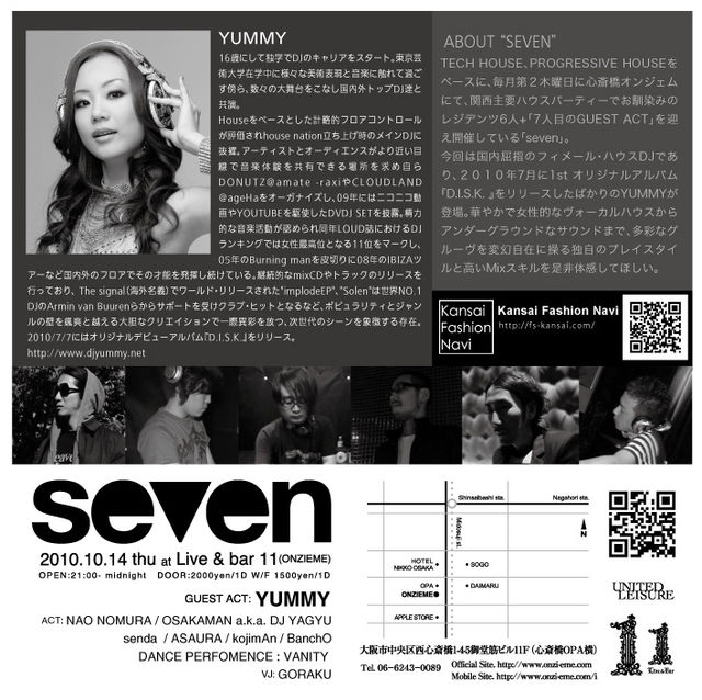 2010.10.14 thu SEVEN @ Live & Bar 11(ONZIEME) OPEN 21:00 DOOR:2000yen/1D with flyer 1500yen/1D GUEST ACT:DJ YUMMY ACT:NAO NOMURA/OSAKAMAN a.k.a DJ YAGYU/senda/ASAURA/kojimAn/Bancho VJ:GORAKU DANCE PERFOMENCE : VANITY ジャンル:HOUSE Live & Bar 11 [onzieme] 大阪市中央区西心斎橋1-4-5 御堂筋ビル11F TEL:06-6243-0089 http://www.onzi-eme.com/ ■□■□■□■□■□■□■□■□■□■□■□■□■□■□■□■□■□■□■□ mixi特典 人数、お名前を直接メッセージ頂ければ、さらにお得なディス