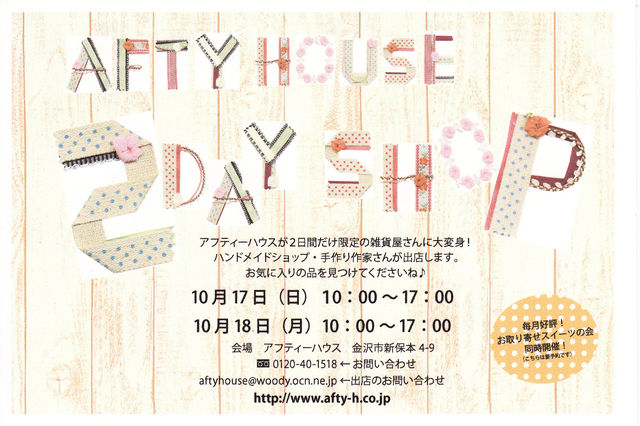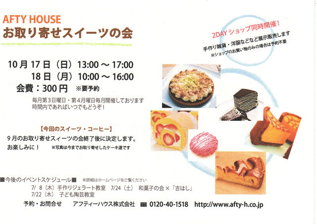 日時:10月17.18日(日.月) 10:00〜17:00 会場:アフティーハウス ----- いつもの「お取り寄せスイーツの会+ぷち2DAYショップ」と違ってアフティーハウス全体が手づくり雑貨屋さんになります。 毎月恒例の「お取り寄せスイーツの会」もあります。 会費 300円 (スイーツ&コーヒー代) 要予約 定員 30名様 ※ショップのお買い物のみは予約不要です。