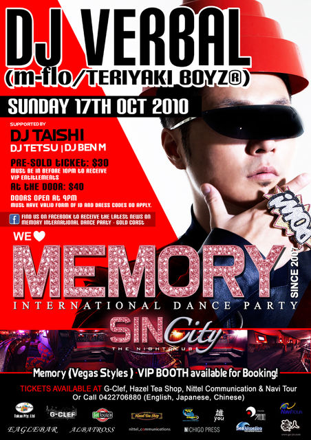 10月17日日曜日"MEMORY"にVERBAL (m-flo/TERIYAKI BOYZ)がSpecial GuestDJとしてやって来ます♪
