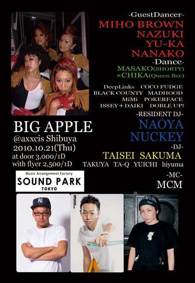 管理人様告知失礼します!! 本日渋谷AXXCISにてNEW PARTY「BIG APPLE」が始まります! GUEST DJにはHARLEMのKID STARRでレジデントをつとめていたDJ NAOYA!! それに加えDJ NUCKEYも出演! GUEST DANCERにはMIHO BROWN+NAZUKI+YU-KA+NANAKO(OH GIRL)も!! 盛り上がること間違いなし!! メッセージいただければ通常3000円のところを1500円/1Dにてご案内します! またメッセージのやり取りが面倒な方は入り口にて ゆーいちのゲストでゆーいち とおっしゃっていただければ何名様でもゲスト料金でご入場できます!!