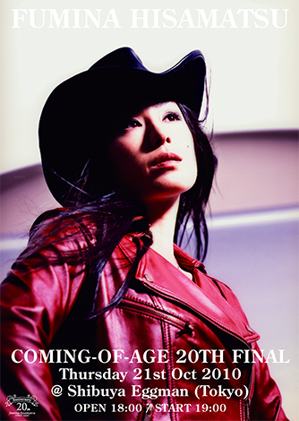 久松史奈20周年記念ファイナル・ライブ "COMING-OF-AGE 20TH FINAL" Thursday 21st Oct 2010 @ Shibuya Eggman(東京) 〒150-0041 東京都渋谷区神南1-6-8 B1F http://eggman.jp/venue TEL: 03 3496 1561 OPEN 18:00 / START 19:00 前売\4,500(税込) / 当日\5,000(税込) − ドリンク別 ファンクラブ優先予約対象ライブ プレイガイド2010年7月31日発売予定 『全てはこの場所から始まった...。』 1990年10月21日シングル『LADY BLUE』でデビューを飾った久松史奈。その3ケ月前 の7月15日、デビューに先駆け行われた渋谷Eggmanでの初ライブ当日の朝、それ