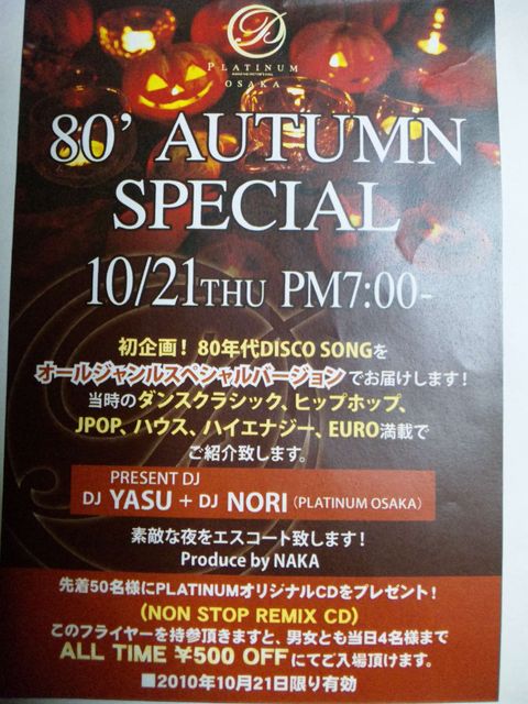 コミ参加の皆さんへ プラチナム初企画 80’AUTUMN SPECIAL 私プロディースで80年オールジャンルで お届けします!!! 番組は神戸King&Queenの 80年バージョンでダンスクラシック、ブラック ハウス、JPOP、ハイエナジー、 EURO満載です 初企画なので皆さんのご参加宜しくお願い致します! ホームページでのご案内 ↓ http://platinum-jp.jp/osaka/html/event.cgi?sele=&year=2010&mon=10#e1285584292