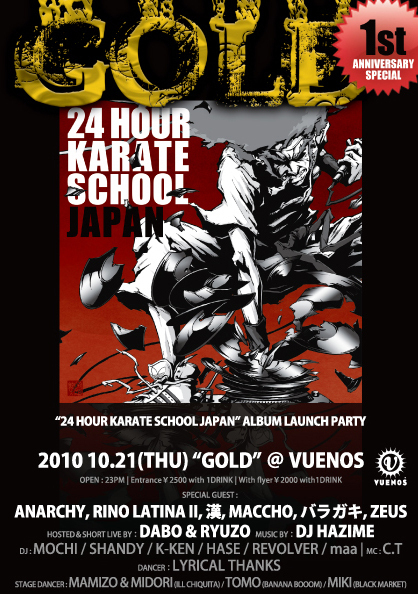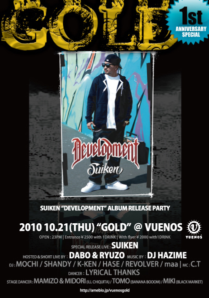 10/21(木)渋谷VUENOS【GOLD】 自分にメッセージ頂くと\3000の所が\1500/1dと大変お得なゲストお取り致します OPEN→23:00 ゲスト料金¥1500/1d GW SPECIALでは900人もの動員数をみせたこのPARTY 毎回がSO SPECIAL GOLDの日はまさに伝説となるに違いない HAZIME、DABO、RYUZOがお届けするHIP HOP PARTY 「GOLD」 この日は1stアニバーサリー SUIKEN“Development"RELEASE PARTY&"24HOUR KARATE SCHOOL JAPAN"ALBUM LAUNCH PARTY& GOLD 1ST ANNIVERSARY!! そしてこのメンツを見てくだ