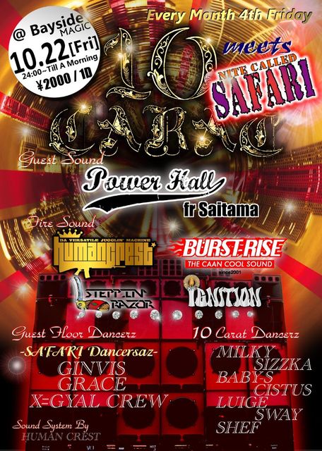 管理人様告知させて頂きます。 "10CARAT meets SAFARI" 10/22(金) @BAYSIDE MAGIC yokohama OPEN:24:00〜Till Morning ADM:¥2000/1D ■GUEST SOUND POWER HALL fr.Saitama ■GUEST DANCERZ GINVIS GRACE X=GYAL CREW ■HOST SOUND HUMAN CREST BURST RISE IGNITION STEPPIN' RAZOR ■10CARAT DANCERZ CISTUS MILKY SIZZKA LUIGE SWAY BABY-S and more!!! ■SOUND SYSTEM HUMAN CREST ※ MUST CHECK ID!!! 2010年2月から始まった横浜の第4金曜のPARTY NIGHT!!