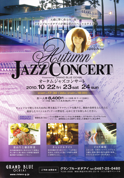 ★10月22日(金)〜24日(日) グランブルーオチアイ(逗子マリーナ内) 「Autumn Jazz Concert」¥8,400(ディナー、コンサート、税込み) 22日(金)18:00〜 高田なみ(vo) ウエキ弦太(gt) 渋谷和利(ba) 23日(土)17:30〜 高田なみ(vo) 砂本典子(pf) 笠原本章(ba) 24日(日)17:30〜 高田なみ(vo) 砂本典子(pf) 大森哲也(ba) *最高の海辺の景色とムーディーで美しい店内、 葉山牛・鎌倉野菜・海の幸満載のディナー、 キャンドルの灯りとデザートタイムのNamiLive・・ 素敵な秋の夜を一緒に過ごしませんか? 希望の方