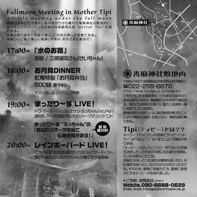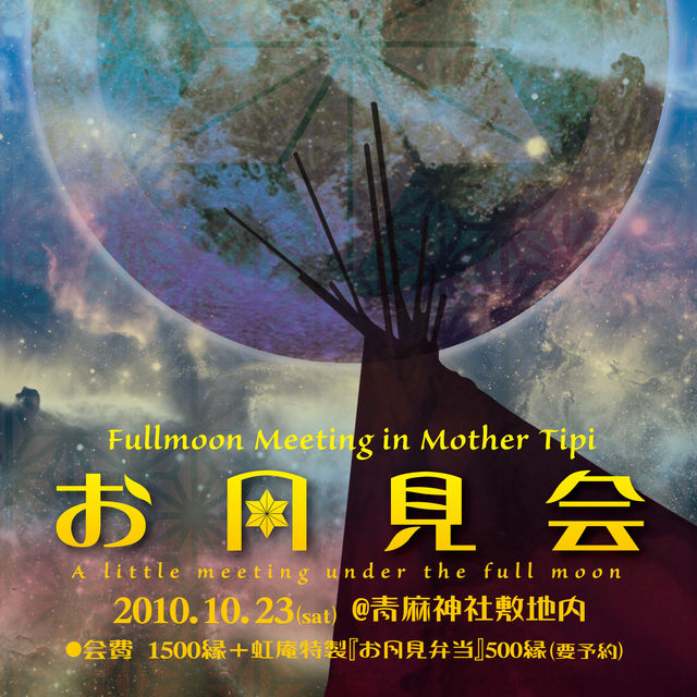 『お月見会』 〜Fullmoon meeting in Mother Tipi〜 青麻山のふところ深く、街の明かりから離れた青麻神社の敷地内にネイティブアメリカンの伝統的な移動用住居『Mother Tipi』が現れます! 四季の移り変わりを肌で感じ、この世の美しさを愛でる会。 美味しいご飯と楽しい音楽。今宵は、お月さまと宴会だ! 2010年10月23日(土) @青麻神社 (敷地内の空き地) 会費:1,500縁+ご希望の方だけ、虹庵特製『お月見弁当」500縁(要予約) 〒983-0821 宮城県仙台市宮城野区岩切青麻山 TEL. 022-255-6670 http://www12.p