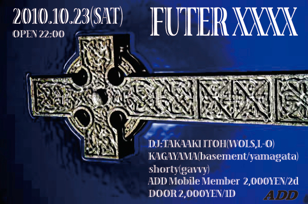 FUTER XXX 2010.10.23 sat @ADD 22:00start ADD Mobile Member 2,000YEN/2D,DOOR 2,000YEN/1D DJ:TAKAAKI ITOH(WOLS,L-O),KAGAYAMA(basement/yamagata),shorty(gavvy) basement主催kagayama氏がADDにてDJします。 お時間ある方は是非遊びにいらしてください。 テクノ祭りな夜になりそうですよ♪