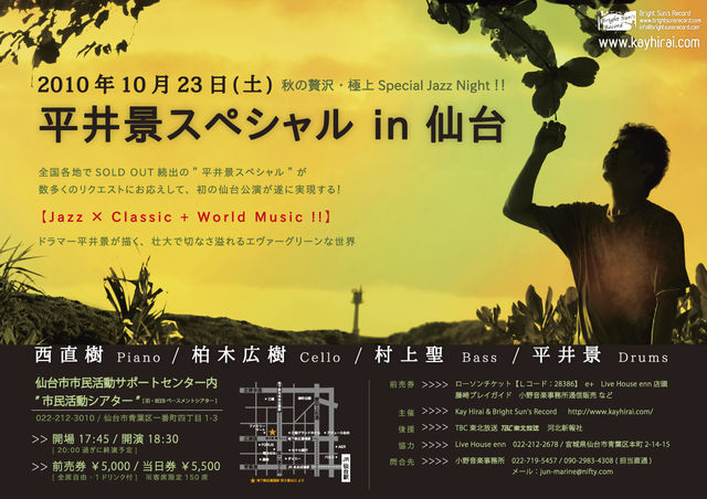 昨年、リーダーアルバム「SORA」をリリースして、ますます全国的に話題の あの「平井景スペシャル」に、チェロの柏木さんが参加されます。 東北方面の方、この貴重なコンサート。お見逃しなく!! 以下、ドラマー平井景さんのメルマガより抜粋です----- ┏━―━―━―━―━―━―━―━―━―━―━―━―━―━―━―━―━―━―━ ┃ 10月23日(土)【 平井景 スペシャル in 仙台 】 ┃ −秋の贅沢・極上ジャズナイト− ┃ ┃ At 宮城・仙台市市民活動サポートセンター内"市民活動シアター" ┃ (旧・BEEBベースメントシアタ