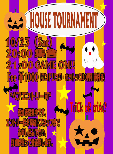 毎月恒例ハウストーナメントを開催します。 開催日時:10/23(Sat) 20:00集合・21:00開始 エントリフィー:¥1000(1ドリンク、1ホットック50円引券付) 入賞者にはHiVeポイント、若しくはドンキホーテ商品券進呈! その他にもアワード賞でもHiVeポイントが貰えたり、他テナント様からの商品も!? ペアエントリー可なので、御一人では心細い方もお友達とペアで御参加頂けます。 尚、ハウスの模様は写真で、決勝戦は動画で9dartsTVにアップされます。 エントリーはなるべく前日までにお済ませ下さい。 是非皆様お誘い合わ