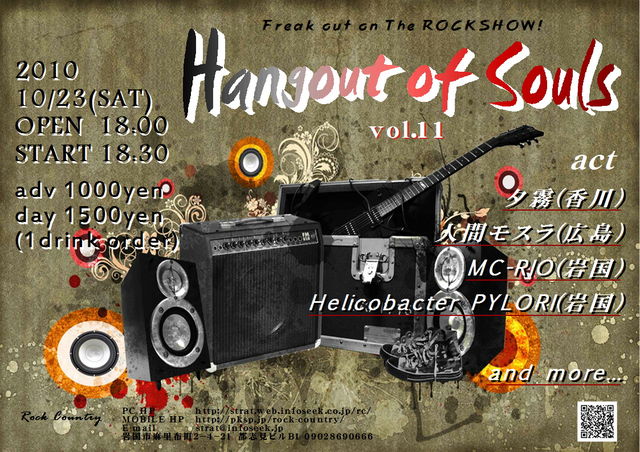 10/23(土)@Rock Country 「Hangout of Souls vol.11 」 OPEN 18:00 START 18:30 adv \1000 day \1500 (要1drオーダー) ■act■ ☆夕霧(香川) ☆MC-RIO(岩国) ☆人間モスラ(広島) ☆Helicobacter PILORI(岩国) and more...