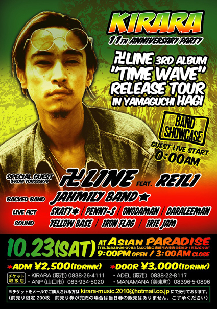 管理人さんスペースお借りします。 卍LINE【まんじらいん】レゲエイベント告知 2010年夏、3作目となるニューアルバム『TIME WAVE』をリリースした 卍LINEが山口に再登場! 今回は山口県内2DAYS!! 10月23日(土)萩のAsianPARADISE(吉田町 石丸ビル2F)にて、 生バンドでの卍LINEのレゲエライブ決行!! SPECIAL GUEST 卍LINE Feat REILI BACKED BAND JAHMILY BAND★ Live act SKATY★ PENNY-S ONOD