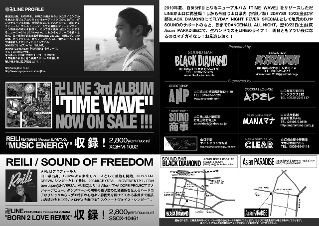 管理人さんスペースお借りします。 卍LINE【まんじらいん】レゲエイベント告知 2010年夏、3作目となるニューアルバム『TIME WAVE』をリリースした 卍LINEが山口に再登場! 今回は山口県内2DAYS!! 10月23日(土)萩のAsianPARADISE(吉田町 石丸ビル2F)にて、 生バンドでの卍LINEのレゲエライブ決行!! SPECIAL GUEST 卍LINE Feat REILI BACKED BAND JAHMILY BAND★ Live act SKATY★ PENNY-S ONO