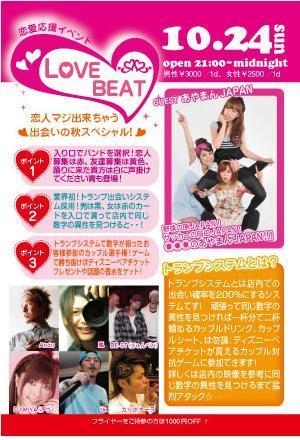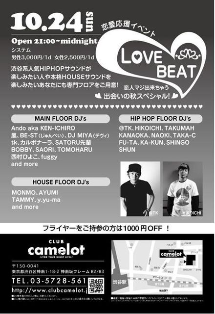 10月24日に 日本最大規模のCLUBイベント「LOVE BEAT」 渋谷人気店キャメロットにて、開催 毎回1000人超えのイベント 年末クリスマスイブは1900人 今回のゲストは今超話題の あやまんJAPAN 3フロア開催で、 メインフロアは元あいのりメンバーを中心に、DJ、ライブ等のパフォーマンスもあり、大物ゲストあり超人気メンバーも登場 HIPHOPフロアHOUSEフロアは都内で活躍中のDJが盛り上げています 終電迄でも大盛りあがりのイベントなので、次の日仕事の人でも是非 みん
