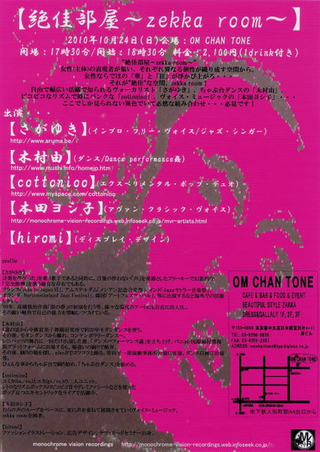 告知失礼致します。 "女性(主体)の表現者が集い、それぞれ異なる個性が織り成す空間から、女性ならではの「華」と「狂」が浮かび上がる・・・ それが"絶佳"な空間、zekka room! 自由で幅広い活躍で知られるヴォーカリスト「さがゆき」、ちゃぶ台ダンスの「木村由」など、 ここでしか見られない異色でいて必然な組み合わせ・・・必見!!! " 【絶佳部屋〜zekka room〜】 時:2010年10月24日(日) 場所:om chan tone(オム チャン トーン) 東京都日本橋富沢町 4−11岸ビル http://omchantone.at.webry.info/ 時間:open:17:30/s