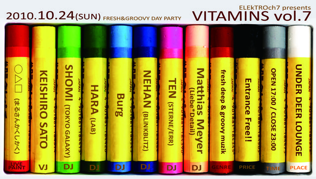 管理人さま 不適切だと判断された場合 お手数ですが 削除のほど 宜しくお願い致します。 2010/10/24(SUN) ELEkTROch7 presents FRESH&GROOVY DAY PARTY 「VITAMINS vol.7」@UNDER DEER LOUNGE http://iflyer.tv/event/68790/VITAMINS-vol.7/ OPEN 17:00 / CLOSE 23:00 GENRE: fresh deep&groovy muzik Entrance Free!! 過去6度に渡り開催されたVITAMINS は立て続けに驚異の盛り上がりをみせ、 記憶に新しい7月のVol.6では奇跡とも言える、梅雨まっただ中の快晴に 夏の始まりを感じる