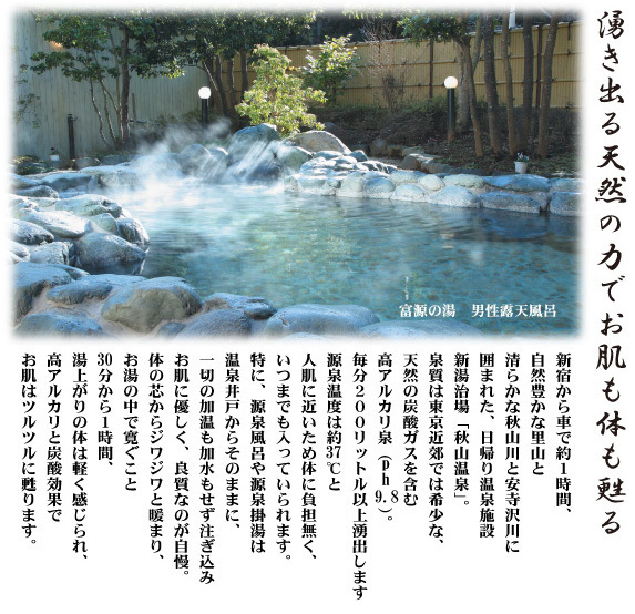 17日に温泉部長の椎名嬢と行ってきました 加水加熱なしの源泉掛け流し温泉です。 体温よりほんのチョットだけ温かい高アルカリ泉ですので、身体に負担が無い 横になって30分位浸かる(寝ちゃう)と、天然のの炭酸ガスがお肌から浸みわたってとってもツルツルになりました 併設の水着で入るスパも、25Mプール併設で泳いでも良いし 屋外のプールは温かい温泉プールで流水、ジャグジー、下からのジェットと3種のプールが楽しめて夜空を眺めながら入るのもまた格別でした ん〜なのでまた行き