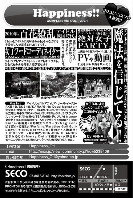 アイドルソングいっぱいかけるCLUB PARTYのお知らせです 現役アイドルによるLIVEもあったり DJ MIX&コピーダンスユニットのAKB48&Hello!Project縛りの時間帯もあります。 中盤にはアニソンtimeもあります 日曜日の夕方開催なので年齢制限もありません(お酒を飲む場合は必要ですよ;) アイドル好きな人とかアイドルになりたい人とか いっぱい集まって仲良くなれるPARTYにしたいです。 高校生割引とかもあるので、皆さん遊びにきてください Happiness!! -COMPLETE the IDOL- VOL.1 http://mixi.jp/vie
