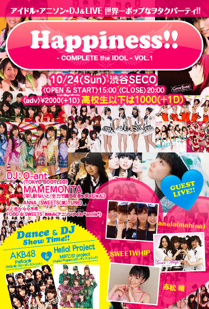 アイドルソングいっぱいかけるPARTYのお知らせです Perfumeのときステージに登って踊ってくれる方も募集中です。 現役アイドルによるLIVEもあったり DJ MIX&コピーダンスユニットのAKB48&Hello!Project縛りの時間帯もあります。 中盤にはアニソンtimeもあります 日曜日の夕方開催なので年齢制限もありません(お酒を飲む場合は必要ですよ;) アイドル好きな人とかアイドルになりたい人とか いっぱい集まって仲良くなれるPARTYにしたいです。 高校生割引とかもあるので、皆さん遊びにきてください Happiness