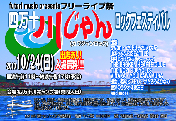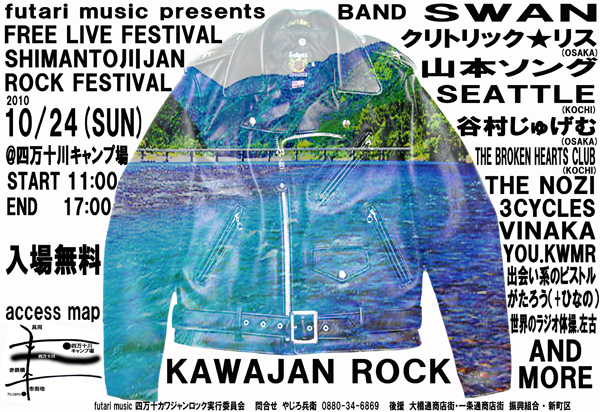 管理人様 イベントの告知をさせて下さい。 高知県四万十市(中村)四万十川で野外ロックフェスティバルを開催いたします。毎月地元ライブハウス.シルバーにてライブイベントを行っているswanが中心となり10数バンドが立ち上がってロックフェスを開催します。今年第一回目は実験的ライブにつきフリーライブ(入場無料)で開催します。 四万十市民及び 市外・県外からの参加者を募り、自然豊かな四万十川と柄を幅広く知らしめ、娯楽施設の少ない四万十市において、音楽による無料の娯楽を提供し、若者及び幅広い市民層の文化交流と、音楽を楽しむ