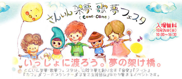 さんいん架夢歌夢フェスタ 10月24日(日)開催 さんいん架夢歌夢フェスタは山陰で創り出す『音楽』『アート』『カフェ』『フードプランナー』『子育て支援団体』などが集まるイベントです。 [HP] http://www.chocos.tv/come2fes/ 興味のある方は是非、コミュ二ティ参加お願い致します [コミュ二ティ] http://mixi.jp/view_community.pl?id=5257016 〜豊潤な水、豪快な海と四季を彩る山々に囲まれた街・松江市〜 〜古代より、山陰伝統文化の担い手である魅惑の街・松江市〜