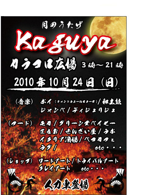 いつでも街中に宴を… をコンセプトに、毎月 満月の夜にカラコロ広場でパーティーをする・・その第1弾です。 広場に飲食ブースやフリマ、音楽、パフォーマンス、アートストリート etc 入場料は無し! ふらっと立ち寄って音楽やパフォーマンスを楽しみながら1杯やったり、美味しいものを食べて。。 参加飲食店: モカ・グリーンズベイビィ・まるお・ラボ・ラグ・イタリア酒場・ペコカフェ・ぜんざい屋・etc 音楽 : モーリー(ギターインスト)&パーカッション・和太鼓 etc アート: ワードアート・トライバルアート・ク