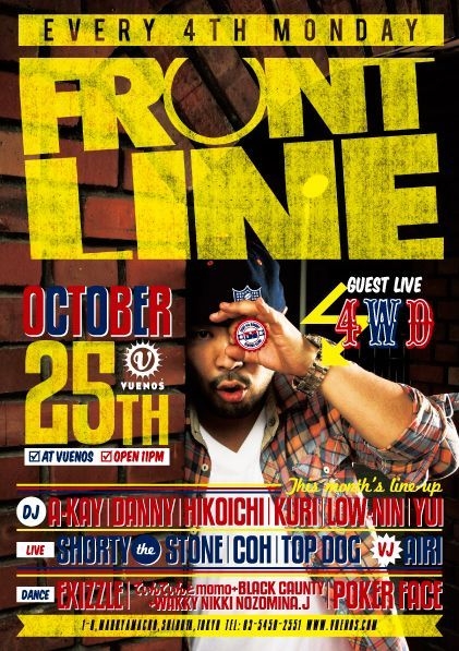 ■■■■■DJクリのゲストでクリと言えばディスカウントなります■■■■■ 毎月第四月曜日と言えば!ハイ、そうです。「FRONT LINE」です 今月のGUESTはNEW ALBUM"CLOCK WORK"をリリースした4WD 全国各地で大反響のアルバムをひっさげてぶちかましに来てくれます DJ A-KAYを中心としたレギュラーDJ's、SHORTY THE STONEのLIVEにDANCE SHOWCASEも必見です 10月25日(月) FRONT LINE@VUENOS TOKYO ◆GUEST LIVE◆ 4WD ◆DJ◆ A-KAY/ DANNY/ HIKOICHI KURI/ LOW-NIN/ YUI ◆LIVE◆ SHO