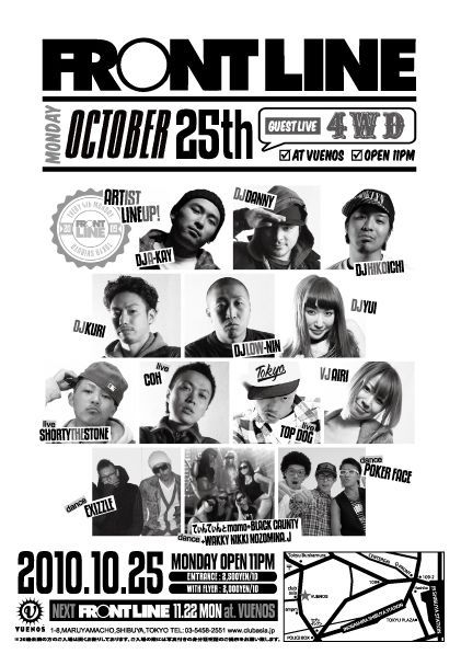 ■■■■■DJクリのゲストでクリと言えばディスカウントなります■■■■■ 毎月第四月曜日と言えば!ハイ、そうです。「FRONT LINE」です 今月のGUESTはNEW ALBUM"CLOCK WORK"をリリースした4WD 全国各地で大反響のアルバムをひっさげてぶちかましに来てくれます DJ A-KAYを中心としたレギュラーDJ's、SHORTY THE STONEのLIVEにDANCE SHOWCASEも必見です 10月25日(月) FRONT LINE@VUENOS TOKYO ◆GUEST LIVE◆ 4WD ◆DJ◆ A-KAY/ DANNY/ HIKOICHI KURI/ LOW-NIN/ YUI ◆LIVE◆ SHORT
