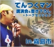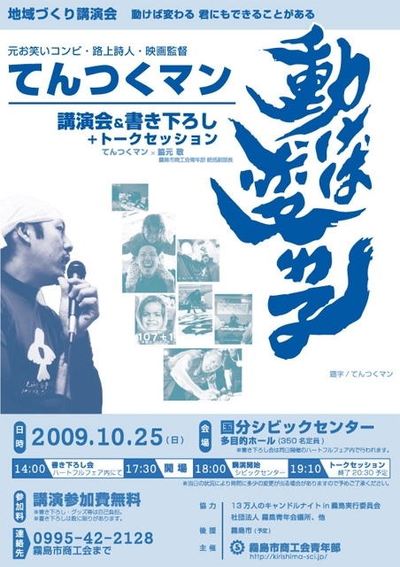 鹿児島県霧島市から てんつくマン講演会&書き下ろしパフォーマンスのお知らせです。 (同日国分シビックセンターにて開催のハートフルフェア内にて) http://kirishima-sci.jp/tentsuku-man/tentsuku.pdf ☆書き下ろしパフォーマンス 〜あなたを見てインスピレーションで言葉を贈ります〜 ・14:00〜16:00 (整理券配布開始13:30〜/先着50名様限定・参加費自己負担) ☆地域づくり講演会〜動けば変わる 君にもできることがある〜 開場 17:00 開演 18:00 (講演終了20:30予定)