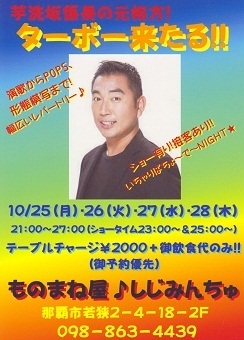 10月のイベントdayは、【芋洗坂係長】の元相方の【ターボー】さんをゲストに、歌真似あり形態模写ありネタありのイベントを企画してみました この【ターボー】さん、TUBEの前田さんを唄わせたら日本一 しかも、前田さん御本人のお墨付き 以前、日本テレビ系列【夜もヒッパレ】で、【ゴージャップ】として出演し、ジャニーズメドレーを芋洗坂係長と共に唄って踊っていた経歴を持ってる方なんです TUBEなどのポップスから、細川たかしさんなどの演歌、はたま
