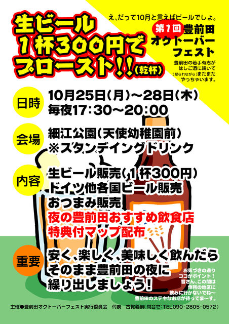 な、な、なんと、下関でも史上初!、豊前田商店街での『豊前田オクトーバーフェスト2010』をやっちゃいます。 ビール1杯300円、その他、世界各国のビールやおつまみなどカウンターで現金引き換えで売って、そのまま会場内で立ち飲みでお楽しみいただけます(ま、角打ち気分ですね)。 で、ぜひその後は、豊前田の飲み屋さんや料理屋さんに立ち寄ってねという、自主的地域貢献企画がスタートします。 日時 10月25日(月)〜28日(木) 夕方5時30分〜8時まで。 会場 細江公園(天使幼稚園前) 内容 300円生ビール販売