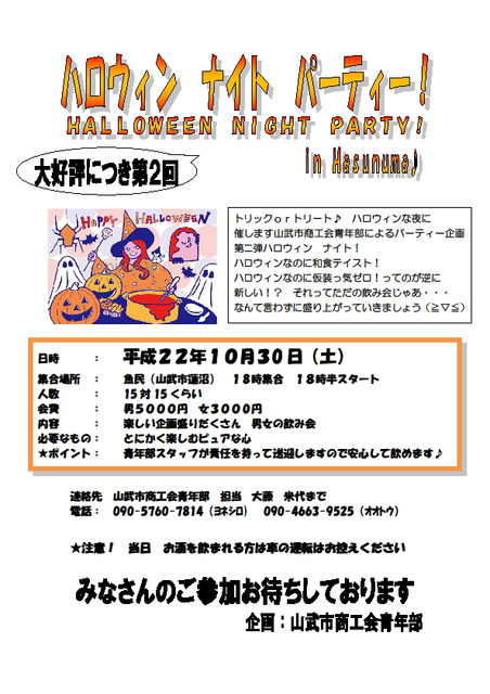 山武市商工会青年部プレゼンツ第二弾 昨年開催した コンカツBBQが好評につき コンカツ系? イベントを今年も開催させていただくことになりました その名も 『★ハロウィン・ナイト★』 ハロウィンの夜にみんなで楽しく盛り上がろう!というスバラシイ企画 平たく言えば ただの飲み会w しか〜し目的は 地域の独身男女のみなさまに出会いのきっかけを提供 して地元を盛り上げていこうという崇高なものなのです(たぶん) ですので、新しい出会いを求める方 ただ単にイベント好きな方ウエルカム( ̄▽ ̄)