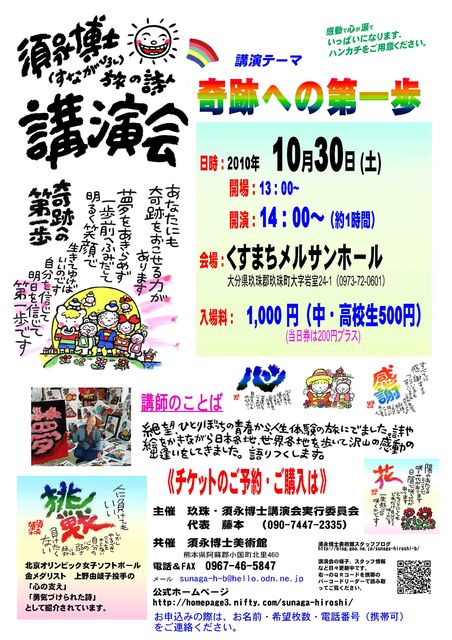 「須永博士(すながひろし)」日本各地、旅をしながら詩や絵を書いている詩人です。 47年間の旅の中で出逢ってきた人々の素晴らしい人生や、須永博士自身の旅での涙、感動、出逢いの話をします。 「本気をだせば なんでもやれるよ 生きるってすばらしい」 を、伝えたい・・・。 2010年10月30日(土) 大分県玖珠郡玖珠町 くすまちメルサンホールにて 須永博士講演会「奇跡への第一歩」 開場 午後1時 開演 午後2時〜 大人1000円 中高生500円(玖珠町民の中・高校生に限り 300円