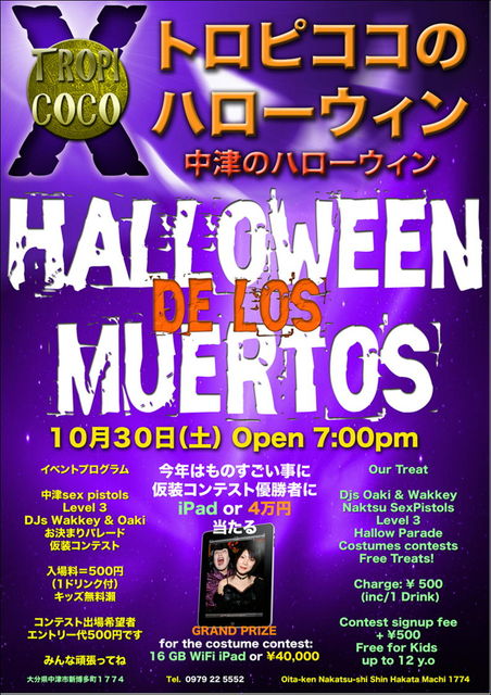 中津のメキシコ料理屋!!! 今週土曜日は中津のハロウィンパーティは絶対!! TROPICOCO CAFEのハロウィンパーティ!!!! 仮装のレベルも高く、今年も優勝商品が去年よりさらにグレードアップ!! な、な、なんと!!! 今、話題のiPad or 賞金4万円!!!!!! これは。仮装して行くしかないでしょ???? 仮装コンテスト エントリー料金は500円!!! 詳細ははコチラ↓↓↓ TOROPICOCO CAFE HALLOWEEN PARTY!!2010!!!! 2010.10.30(SAT) OPEN 19:00 -入場料- 一般入場
