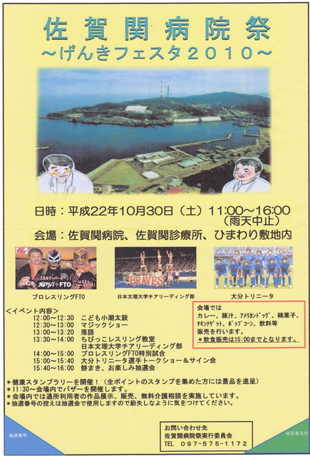 『佐賀関病院祭〜元気フェスタ2010〜』 【日時】平成22年10月30日(土)14:00試合開始(13:30〜ちびっこプロレス教室あり) ※イベントは11:00〜16:00(雨天中止) 【会場】高齢者福祉施設ひまわり敷地内特設リング(佐賀関病院前) 〒879―2201 大分市大字佐賀関750―88 【イベントお問い合わせ】佐賀関病院祭実行委員会 097−575−1172 【参戦選手】 スカルリーパーA−ji、上田馬之助、xXXx、メジロー、新泉浩司、久保希望、谷口勇武、魁 プロレスリングFTO