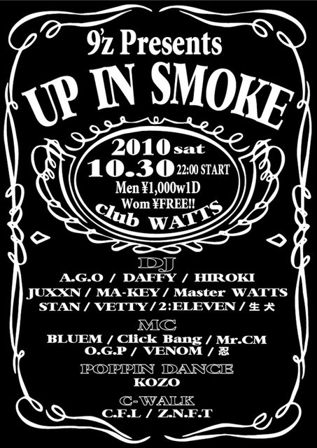 2010/10/30(sat) 9'z Prezents [Up in Smoke] @Club WATTS 22:00 Start Men \1,000w1D Wom \FREE!! [DJ] A.G.O DAFFY HIROKI JUXXN MA-KEY Master WATTS STAN VETTY 2:ELEVEN 生犬 [MC] BLUEM Click Bang Mr.CM VENOM 忍 O.G.P [C-WALK] C.F.L Z.N.F.T [POPPIN DANCE] KOZO [PitBull HP (PC)] http://pitbullsta.web.fc2.com/ [PitBull HP (Mobile)] http://pksp.jp/pitbullkey/ [PitBull Blog] http://ameblo.jp/pitbullsta/ [9'z Blog] http://ameblo.jp/9z-gangsta/