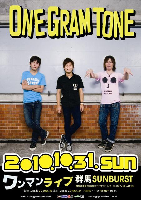 10/31(日)群馬SUNBURST ONE GRAM TONE ワンマンライブ 2010 〜SUNBURST 2nd ANNIVERSARY〜 去年に引き続き、今年も秋のワンマンライブを開催します! 今回はゲスト無し!完全ワンマンです! OPEN/18:30 START/19:00 ADV/¥2,000+D DOOR/¥2,500+D ■info:群馬SUNBURST 027-386-4410 ONE GRAM TONE http://www.onegramtone.com/ 群馬SUNBURST http://www.gtpj.net/sunburst/ チケットはmixiのメッセからでも予約できます!