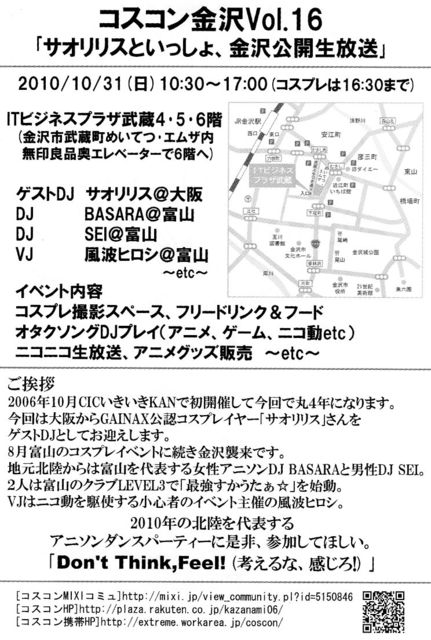 コスコン金沢Vol.16 「サオリリスといっしょ、金沢公開生放送」 2010年10月31日(日)10:30〜17:00 (コスプレは16:30まで) ITビジネスプラザ武蔵4.5.6階 (金沢市武蔵町めいてつ・エムザ内無印良品 奥エレベーターで6階へ) 内容 アニソンDJプレイ、フリードリンク&フード アニメグッズ販売、ニコニコ生放送、 屋外庭園撮影(晴天時) 料金 コスプレする人 1500円 コスプレしない人2000円 *帰宅時アンケート記入で100円キャッシュバックします。 アニソンDJタイム(11:00〜16:00) DJ サオ