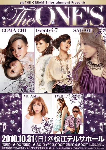 THE ONE'S 10月31日 (日) 松江テルサホール 前売3990 当日4500 開場 16:00 開演 16:30 CAST twenty4-7 COMA-CHI SATOMI TWICE HOST MC AMI and more ホームページチケット問い合わせ http://92.xmbs.jp/cream2010/ 【チケットプレイガイド】 (松江地区) Studio wonder 松江テルサホール ライブハウス canova (出雲地区) Studio wonder ブックセンターCOSMO GROOVY (米子地区) ブックセンターCOSMO ELPAPA イオン日吉津店 ライブハウス Lughs