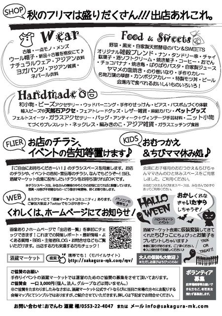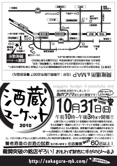 ======================================================= 酒蔵マーケット☆2010秋!! ======================================================= 日程:2010年10月31日(日) 10:00〜15:00開催 ※雨天決行 場所:酒蔵 櫂 ( 山梨市北567 養老酒造内 TEL:0553-22-4047 ) ------------------------------------------------------- 秋の昼間の酒蔵マーケットはなんでもOKのフリーマーケットです! 古着から雑貨、もちろん手作り品などなどが ところせましと並びます! おなかと時間に余裕たっぷりでお越