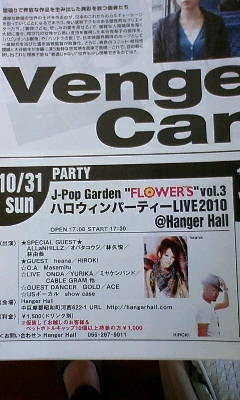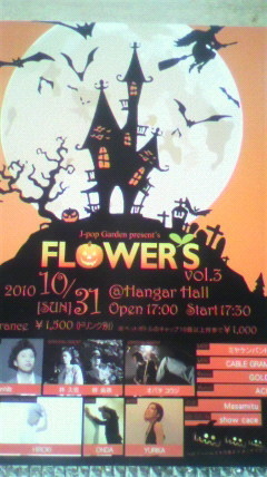J-Pop Garden“ FLOWER'S ”Vol.3 ハロウィンパーティー LIVE 2010 @ Hangar Hall OPEN 17:00 START 17:30〜 \1500- (D別) ■SPECIAL GUEST ALLaNHiLLZ / オバタコウジ / 林久悦 / 林由恭 ■GUEST heana / HIROKI / □O.A Masanitu □LIVE ONDA / YURIKA / ミヤケンバンド / CABELE GRAM 他 □GUEST DANCER GOLD / ACE □USボーカル show cace ※ 仮装してお越しのお客様 & ペットボトルキャップ10個以上持参の方は \1000- (D別) Hangar Hall 山梨県中巨摩郡昭和町河