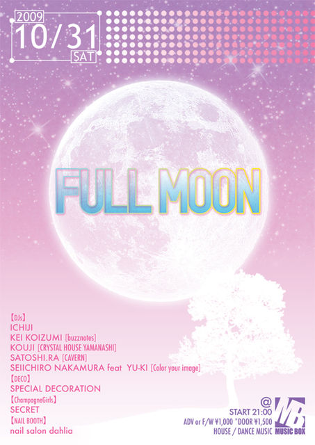 FULL MOON 〜HOUSE/DANCE MUSIC〜 ■DAY: 2009.10.31(SAT) START-21:00〜 ■CAST: *Music by... ★ICHIJI ★KEI KOIZUMI【buzznotes】 ★KOUJI【CRYSTAL HOUSE~YAMANASHI】 ★SATOSHI.RA【CAVERN】 ★SEIICHIRO NAKAMURA feat, YU-KI【Color your image】 *FLOOR ARTIST by... -DECO- ★SPECIAL DECORATION -ChampagneGirls- ★SECRET -NAIL BOOTH- ★nail salon dahlia ■PLACE: -@MusicBox- 甲府市丸の内1-15-8三ツ星ビル2F (juju、Shuroと同じビル)