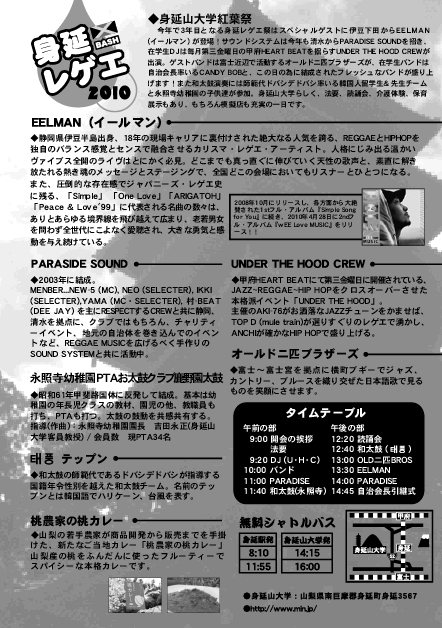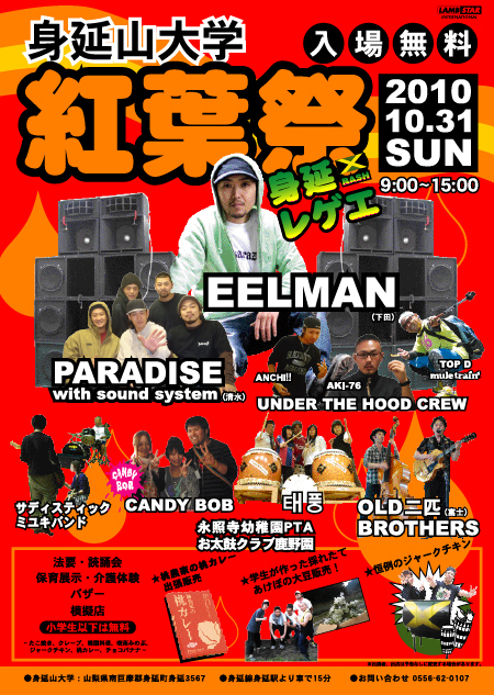 身延山大学 紅葉祭 みのぶレゲエ祭2010 10/31 (日) 9:00~15:00 入場無料 今年は伊豆下田よりEELMANが登場!サウンドは清水よりPARADISE SOUND with sound system、DJには身延山大学の学生によるイベントUNDER THE HOOD@甲府HEART BEAT(毎月第三金曜日)がバックアップ。 富士〜富士宮で活動するオールド二匹ブラザーズをはじめ学生バンド、和太鼓演奏もあり、身延山大学らしく法要、読誦会、介護体験、保育展示等もあります。 もちろん模擬店も充実、桃農家の桃カレーの出張販売、坊さんが育てたあけぼの大豆、韓国人留学生による韓国料理
